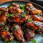 8. Garnish: Remove from the oven and transfer the sticky wings to a serving dish. Sprinkle sesame seeds and chopped green onions over the top for garnish.